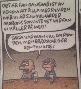 ”Det är fan oansvarigt av honom att dilla med rymden när vi är sju miljarder morons som inte vet vad fan vi håller på med! Säga vad man vill om rymden, men brådskar gör den fan inte.”