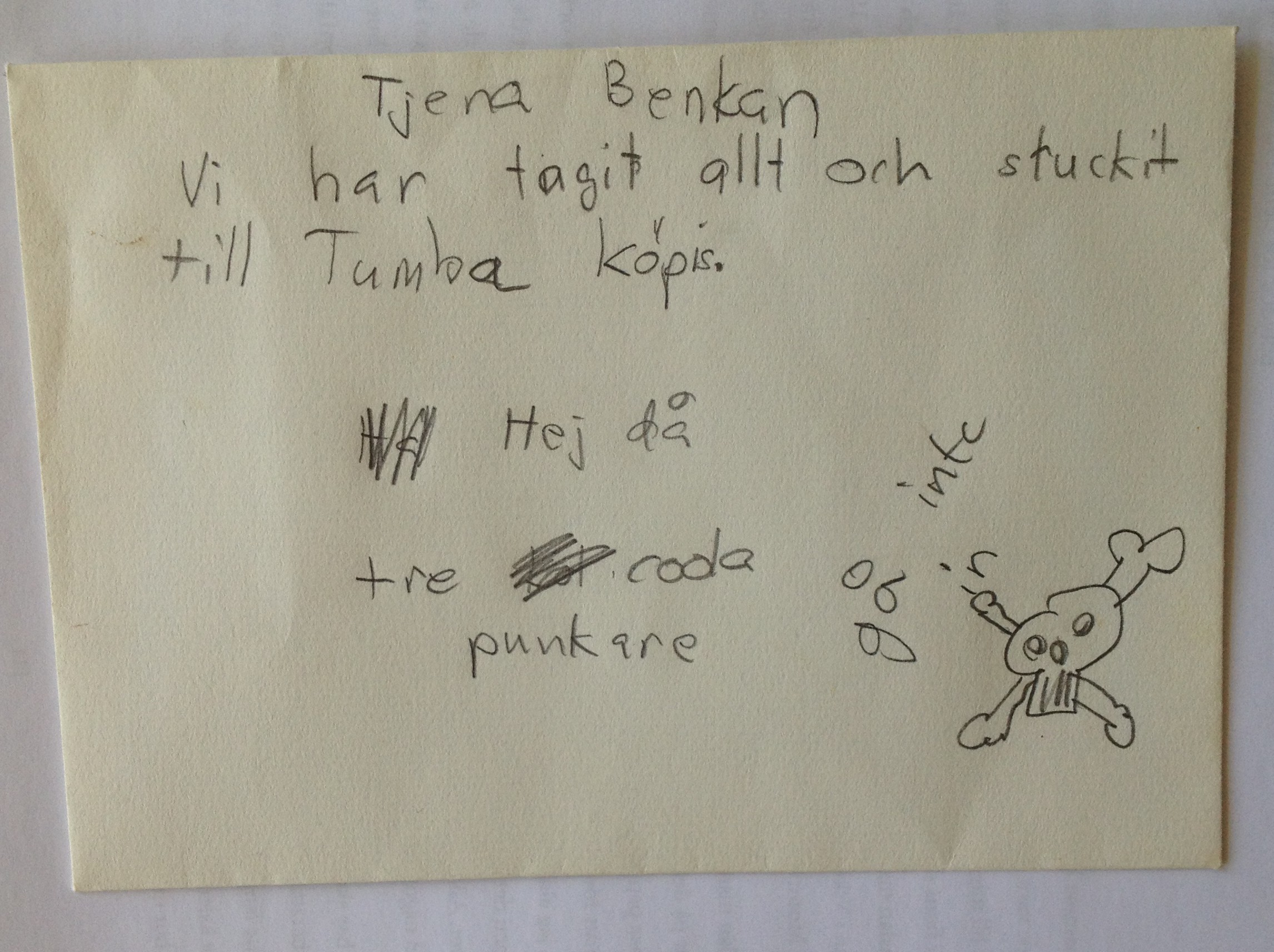 Så här står det: ”Tjena Benkan/Vi har tagit allt och stuckit till Tumba köpis/Hej då … tre coola punkare.” Meddelandet uttrycksfullt illustrerat med en dödskalle.
