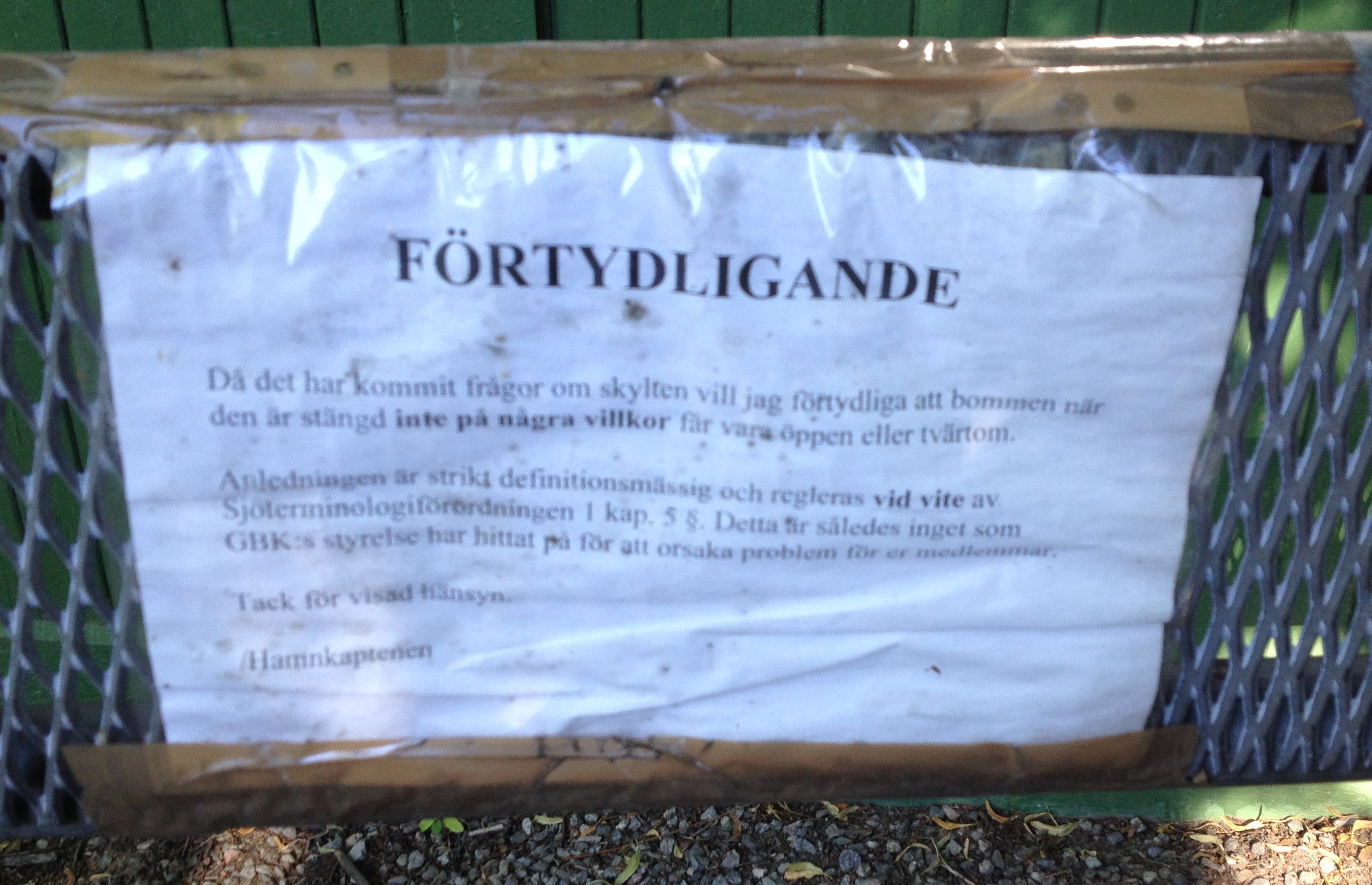 Då det har kommit frågor om skylten vill jag förtydliga att bommen när den är stängd inte på några villkor får vara öppen eller tvärtom.