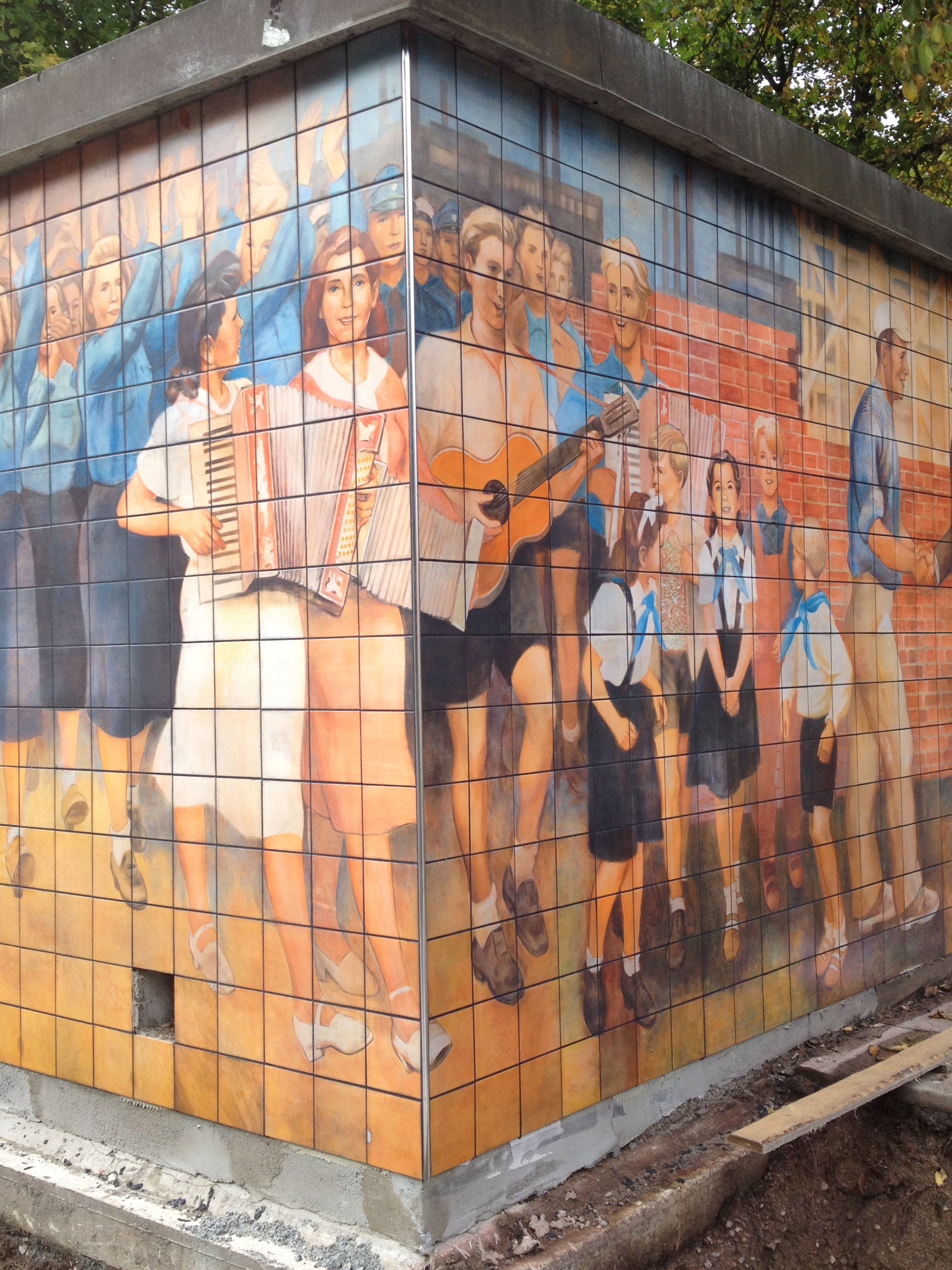 En markvärmecentral i Carolinabacken är dekorerad med en målning av det slaget som regimerna i öst älskade. DDR-kitsch med lyckliga människor som anser att framtiden är deras (bilden uppe till höger).
