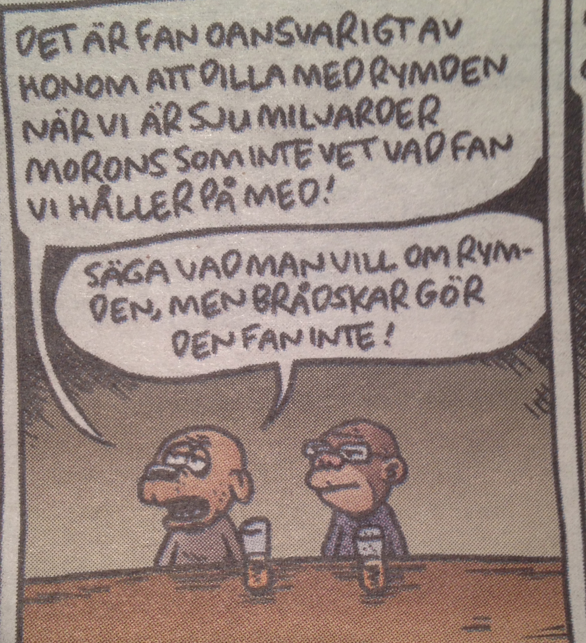 ”Men hallå! Kan de inte slänga ett getöga på oss som är här mittemellan? Här finns också problem att lösa! De kan väl fnula på rymden på sin fritid? Vi har en del mer brådskande ärenden!”