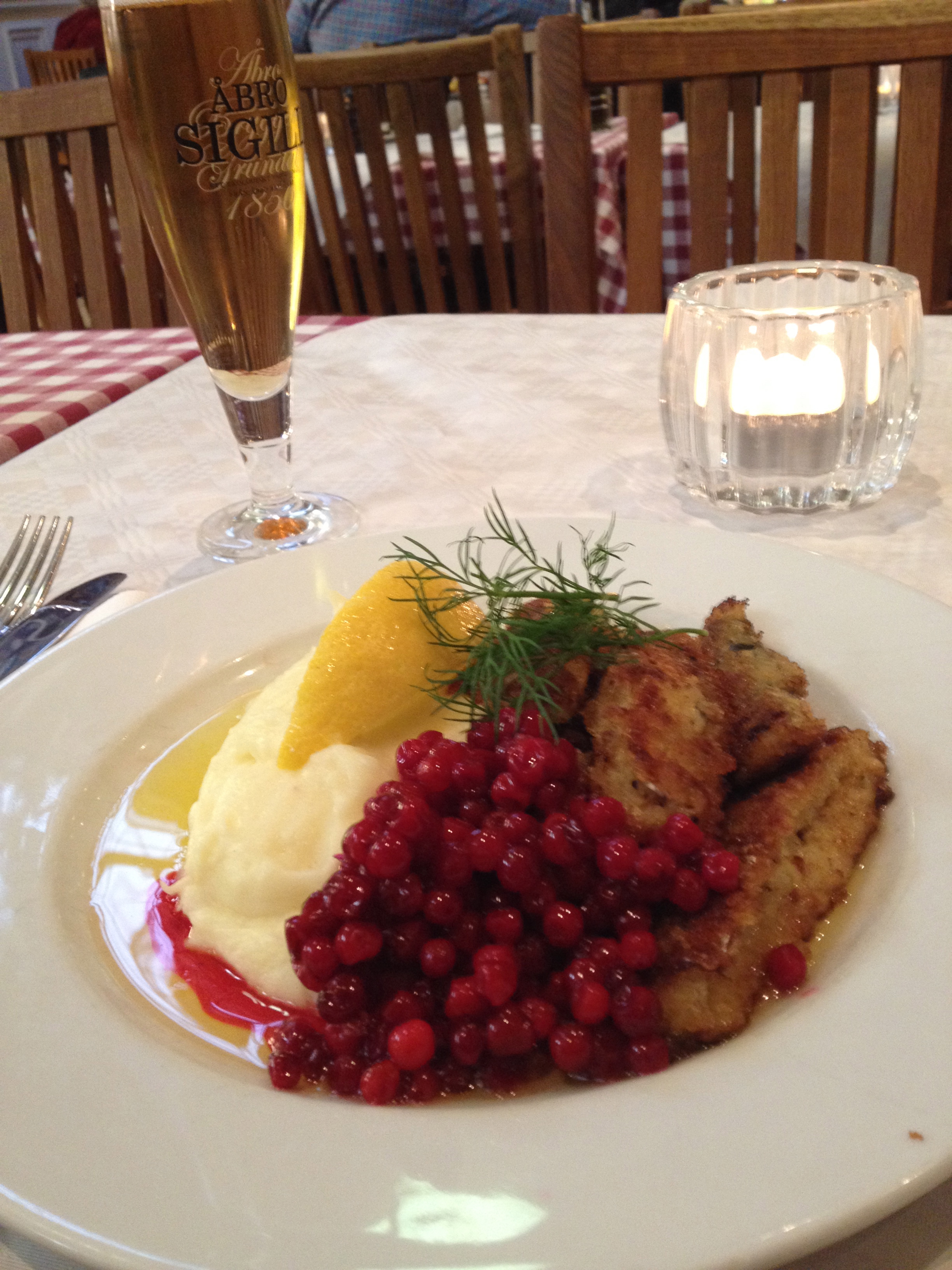Förmiddagen avslutades hos Tysta Mari i Östermalmshallen: stekt strömming med potatismos och rårörda lingon.