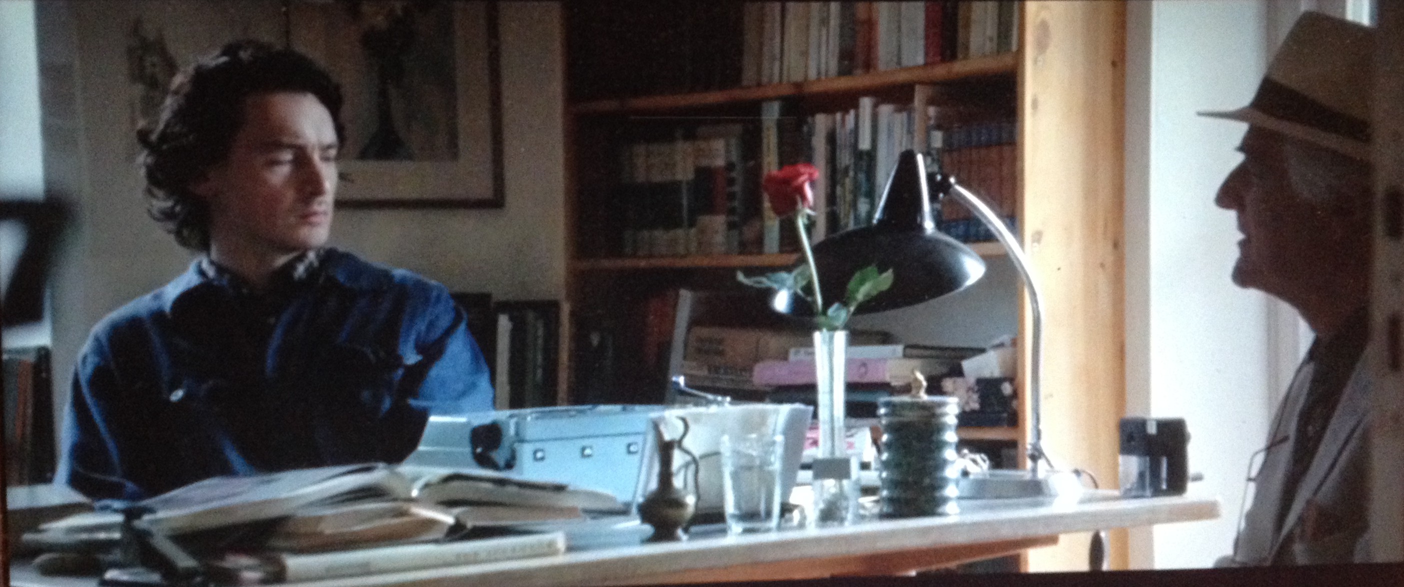 Det avslutande samtalet mellan konstnären och maktens hantlangare rör sig runt en röd ros i en vas.