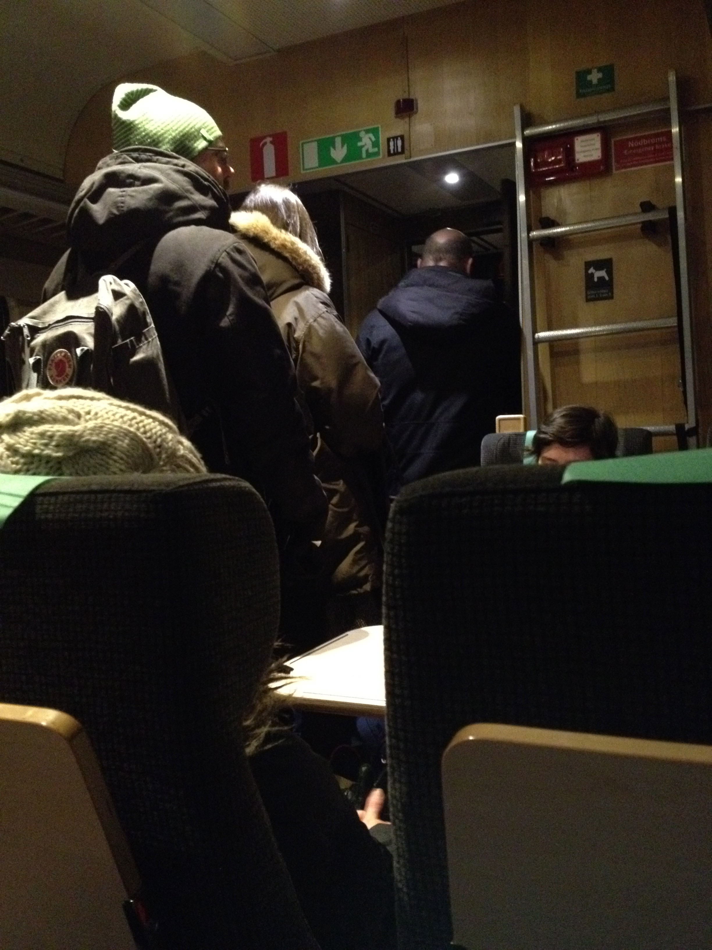 Ingen kommer för att kolla biljetter. Kanske beror det på att det så trångt att det knappast går att ta sig fram genom tåget.