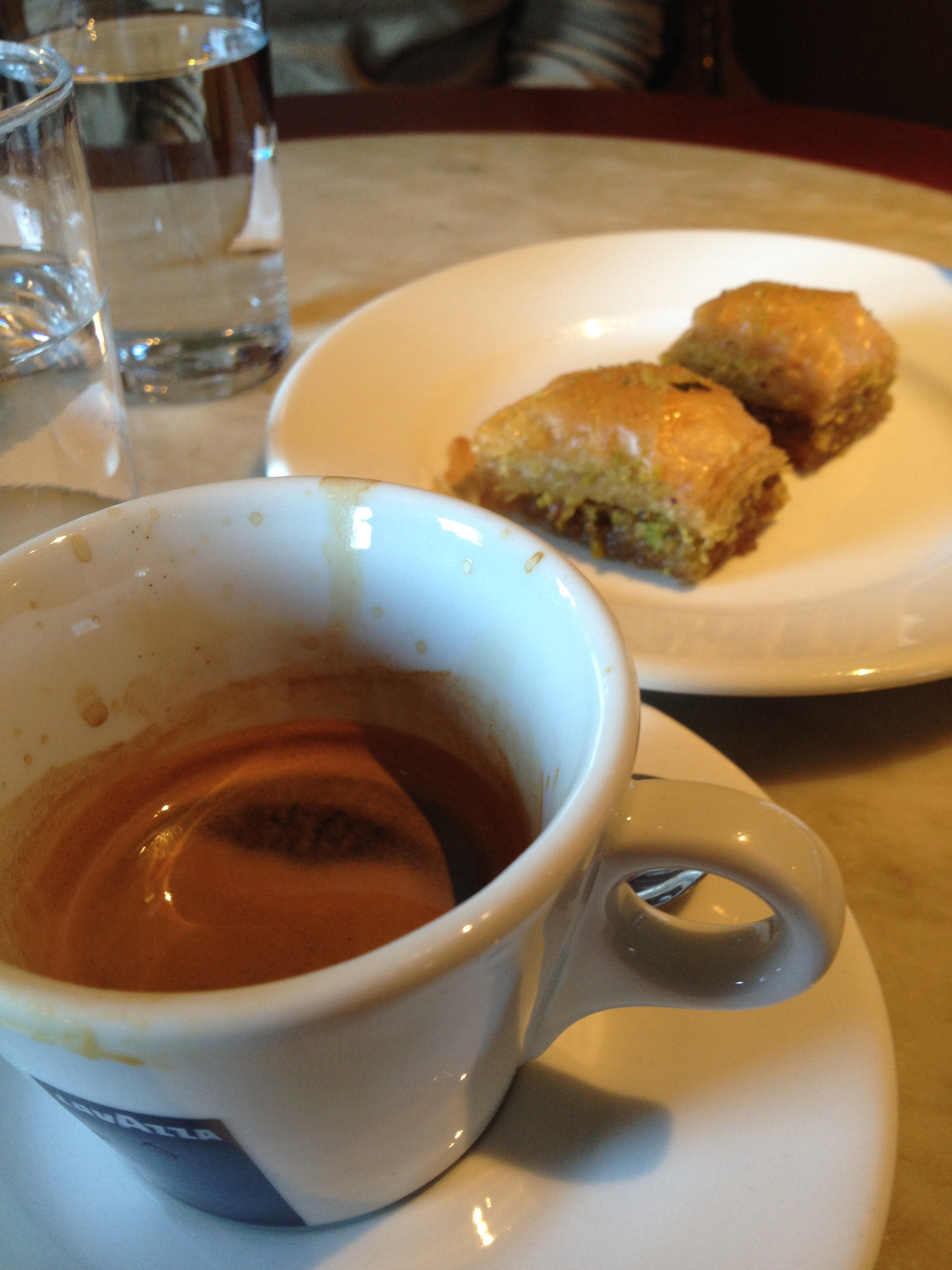 Man kan njuta en espresso med god baklava, samtidigt som man tittar på Neferititi och sprängfyllda skåp med terrakottakrukor från Cypern.