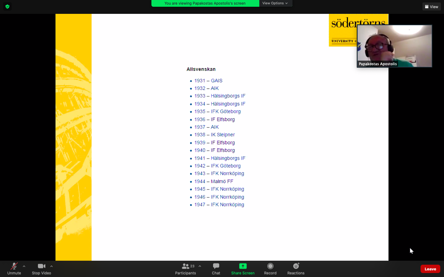 Bilden ovan visades av kollegan Apostolis Papakostas (han är professor i sociologi på Södertörn). Den visar allsvenska seriesegrare mellan 1931 och 1947.