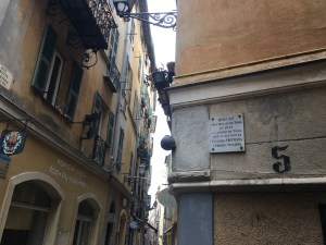 I ett av gathörnen i Nice gamla stadskärna sitter en kanonkula i väggen.